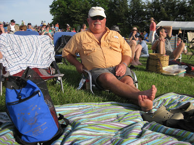 Saturday was Andy's birthday (and our wedding anniversary) so Aiden and I did our best to make it a fun weekend for Dad. Of course he barely rested or relaxed all weekend and still insisted on cleaning, cooking, doing laundry, etc. etc. Even though I'm off of strict bedrest by now and can help a little, I think we've created a machine that can't be stopped! (I know, I need to shut my mouth and be thankful). But we did manage a few birthday weekend luxuries... Hapa and Grandma stopped by after visiting their newest grandchild Phoebe (who missed piling another family milestone on June 26th by only one day) and took us all out to the Flying Goose Brew Pub for lunch. Nothing like a huge burger and a few beers on your birthday... then later that day we went to the June Jam (outdoor concert) at Musterfield Farm.